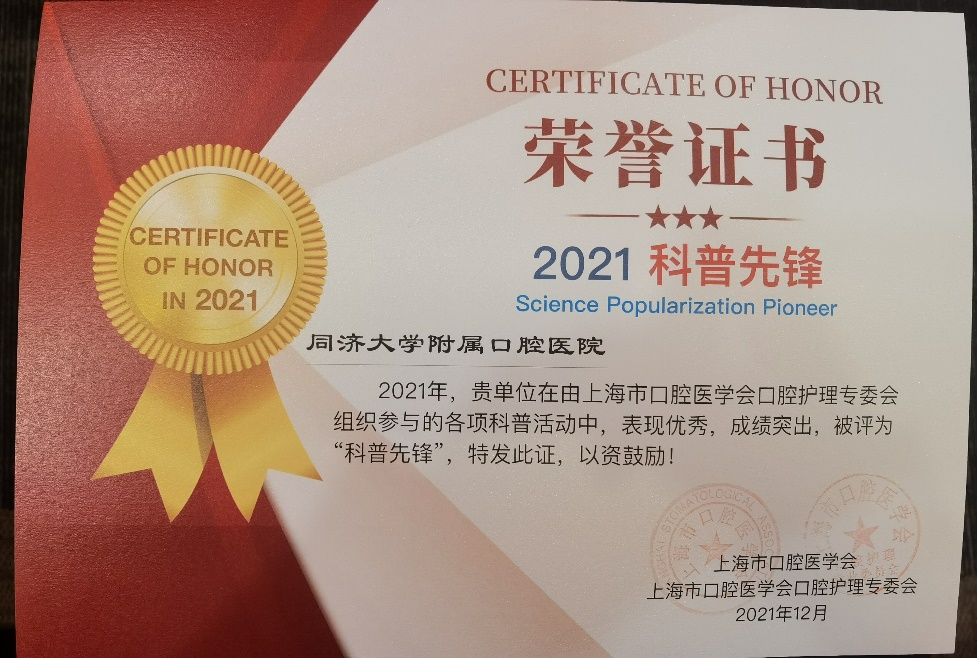 2021 年 12 月 22 日,上海市口腔医学会第一届口腔护理专委会年终总结会议顺利召开。太阳集团官网护理部被光荣授予“2021 科普先锋”的称号,李蝶护士投稿的专委会会标经过层层选拔被选为专委会统一的形象标识,会标的设计和寓意获得了与会专家的高度评价。“十四五”新开局,迈好起航第一步,护理部将立足自身,致力于培养口腔护理青年人才,提升口腔专科护理内涵,助力健康上海、健康中国建设。