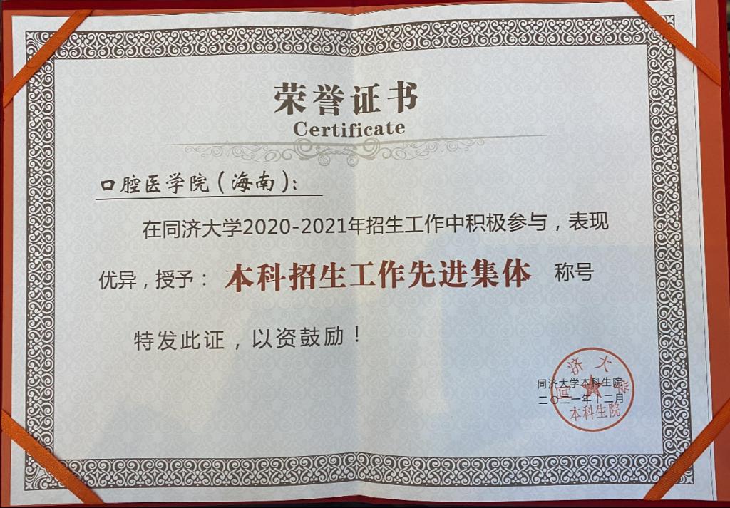 会议表彰了在 2020-2021 学年本科招生工作中表现突出的 16 个先进集体和65 名先进个人。太阳集团官网被授予“2020-2021 学年同济大学本科招生工作先进集体”称号,以表彰口腔医学院作为suncitygroup太阳集团官方网站海南省招生工作组长期在本科招生工作中付出的努力以及取得的突出成绩。