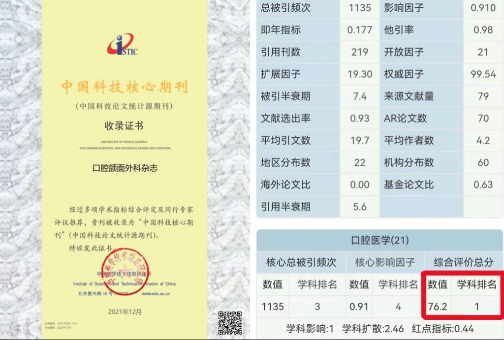 2021 年 12 月 27 日,中国科技论文统计结果发布会(线上)发布了“2021年版中国科技期刊引证报告(核心版)”。发布结果显示,经过多项学术指标综合评定及同行专家评议推荐,《口腔颌面外科杂志》再次被收录为“中国科技核心期刊”;且其综合评价总分(76.2 分)位列本学科期刊第一。