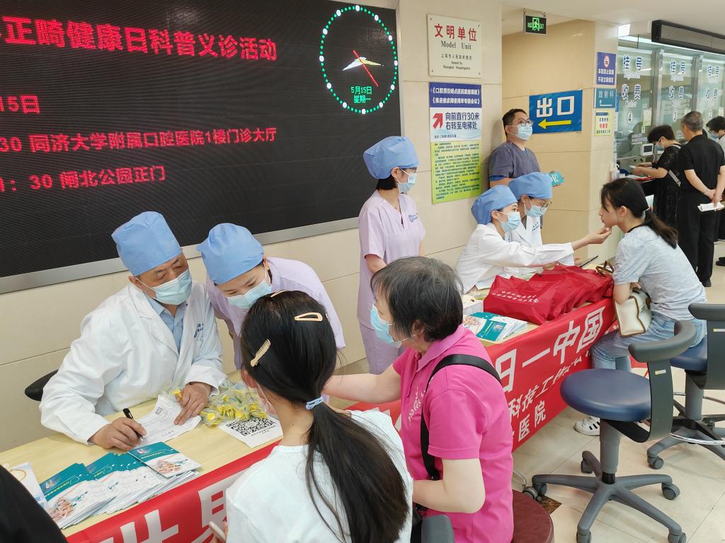 suncitygroup太阳集团官方网站口腔正畸科、护理部积极筹备了本次活动。5月15日上午8:00,医院一楼门诊大厅就聚集了一大批等待咨询的群众,太阳集团官网正畸科医护全员上阵,耐心为群众进行了现场正畸科普讲解及义诊。上午10:00,活动地点转移至闸北公园正门,正畸科医护人员为社区居民开展正畸义诊,派发正畸科普知识宣传册和护齿礼包。群众积极参与并热情提问,医生耐心细致答疑解惑,现场活动气氛十分热烈。