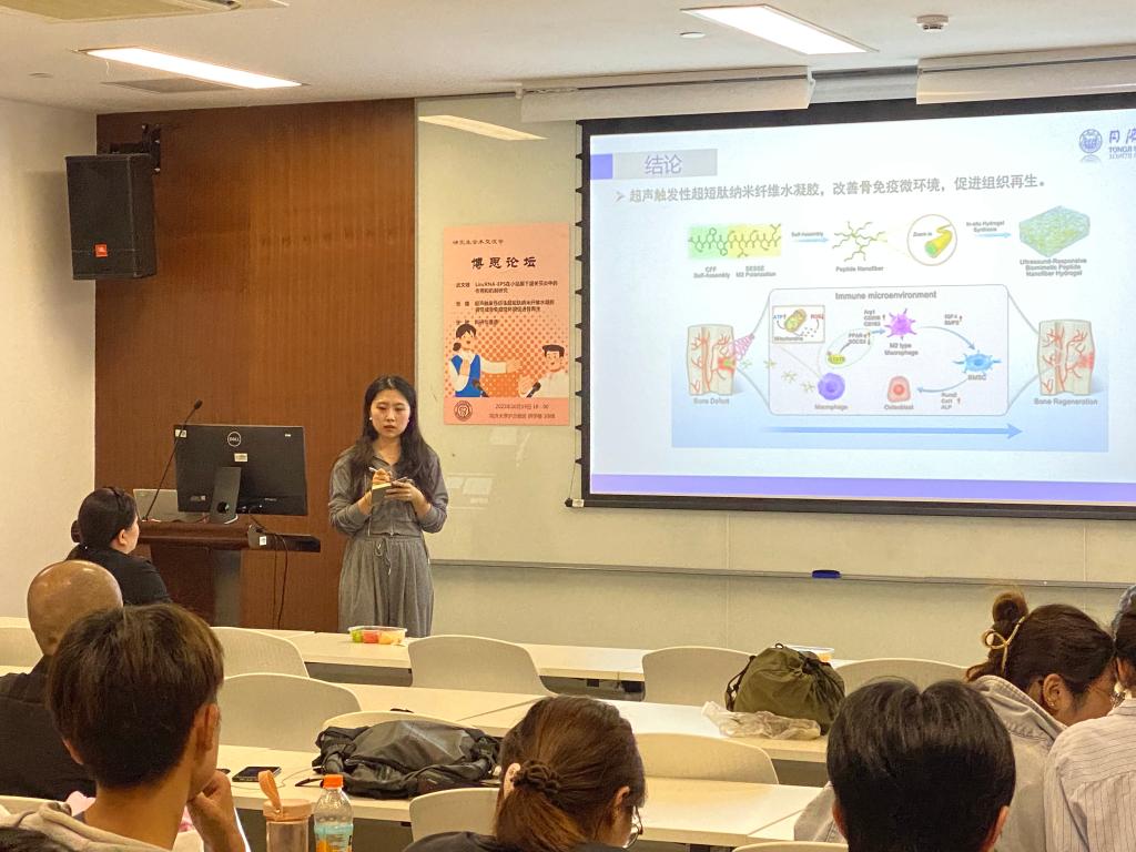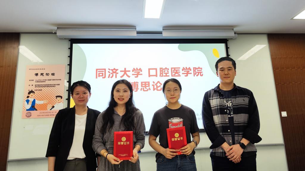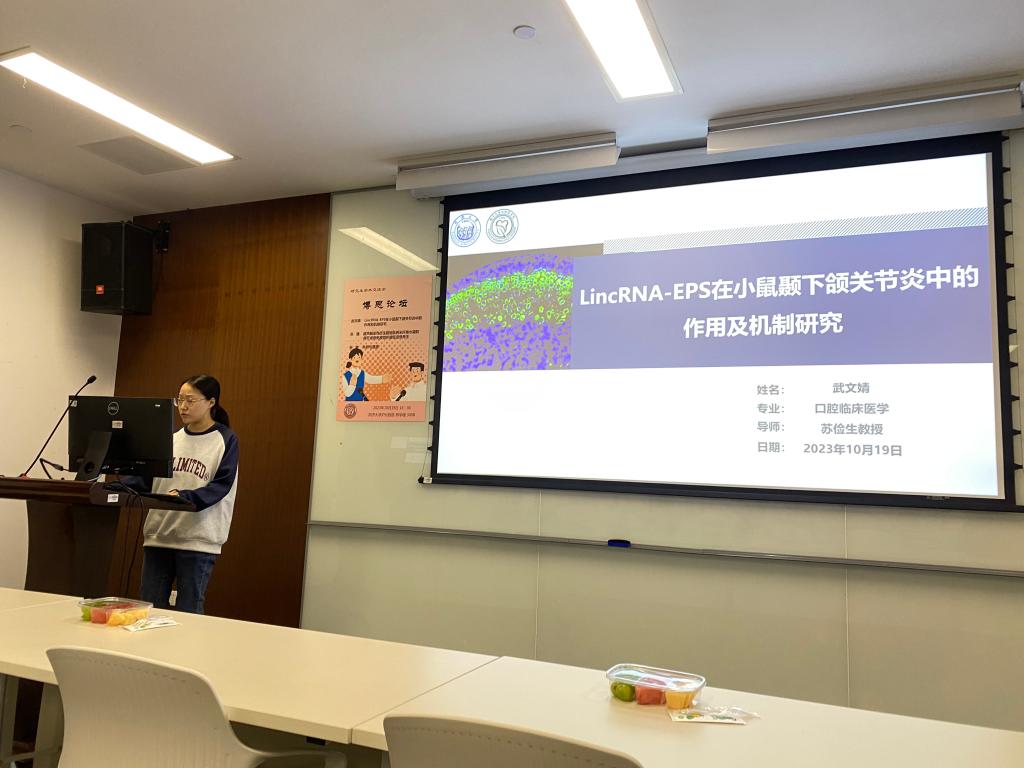本次论坛邀请到suncitygroup太阳集团官方网站口腔医学院的2020级博士研究生武文婧和2019级博士研究生张璠,分别就“LincRNA-EPS在小鼠颞下颌关节炎中的作用和机制研究”、“超声触发性仿生超短肽纳米纤维水凝胶调节成骨免疫微环境促进骨再生”,分享汇报了个人优秀科研成果。口腔医学院教学办主任、牙体牙髓教研室周玥老师,口腔颌面外科教研室王璨老师,口腔医学院研究生辅导员、口腔种植教研室张敏老师作为点评嘉宾出席。口腔医学院全体研究生积极参与,在现场交流了科研经验及心得体会。