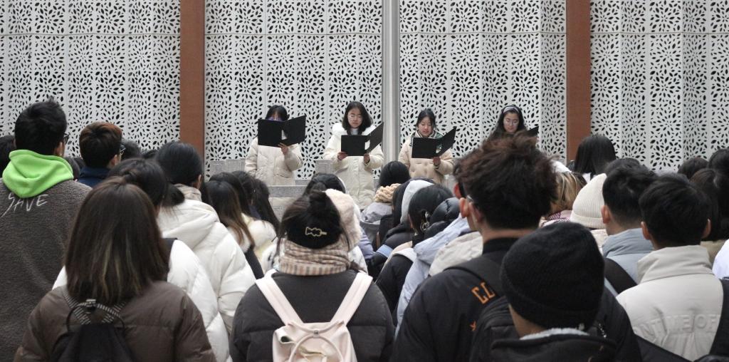之后,由2021级学生代表带来了“强国有我,请党放心”主题朗诵,回顾了中国共产党的历史。从井冈山上的星星之火到如今屹立世界的中华民族,这一切都基于坚持共产党的领导,若没有无数共产党人的砥砺前行,我们就不会有如今的美好生活。同学们在深情地朗诵中传递出了坚定追随中国共产党,以及为党的事业奉献青春的决心。