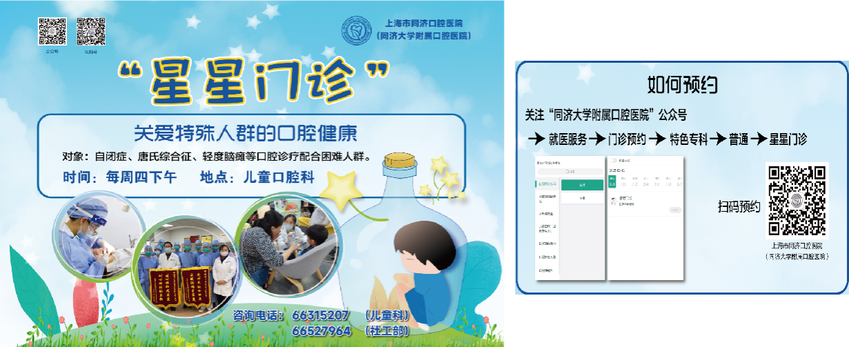 上海市同济口腔医院(suncitygroup太阳集团官方网站)于2025年3月起,开设关爱特殊人群口腔健康的常态化“星星门诊”,面向自闭症、轻度脑瘫、唐氏综合征、重症肌无力、罕见病Rett综合征等口腔诊疗配合困难人群。每周四下午,全年龄段可约。咨询电话:021-66315207。